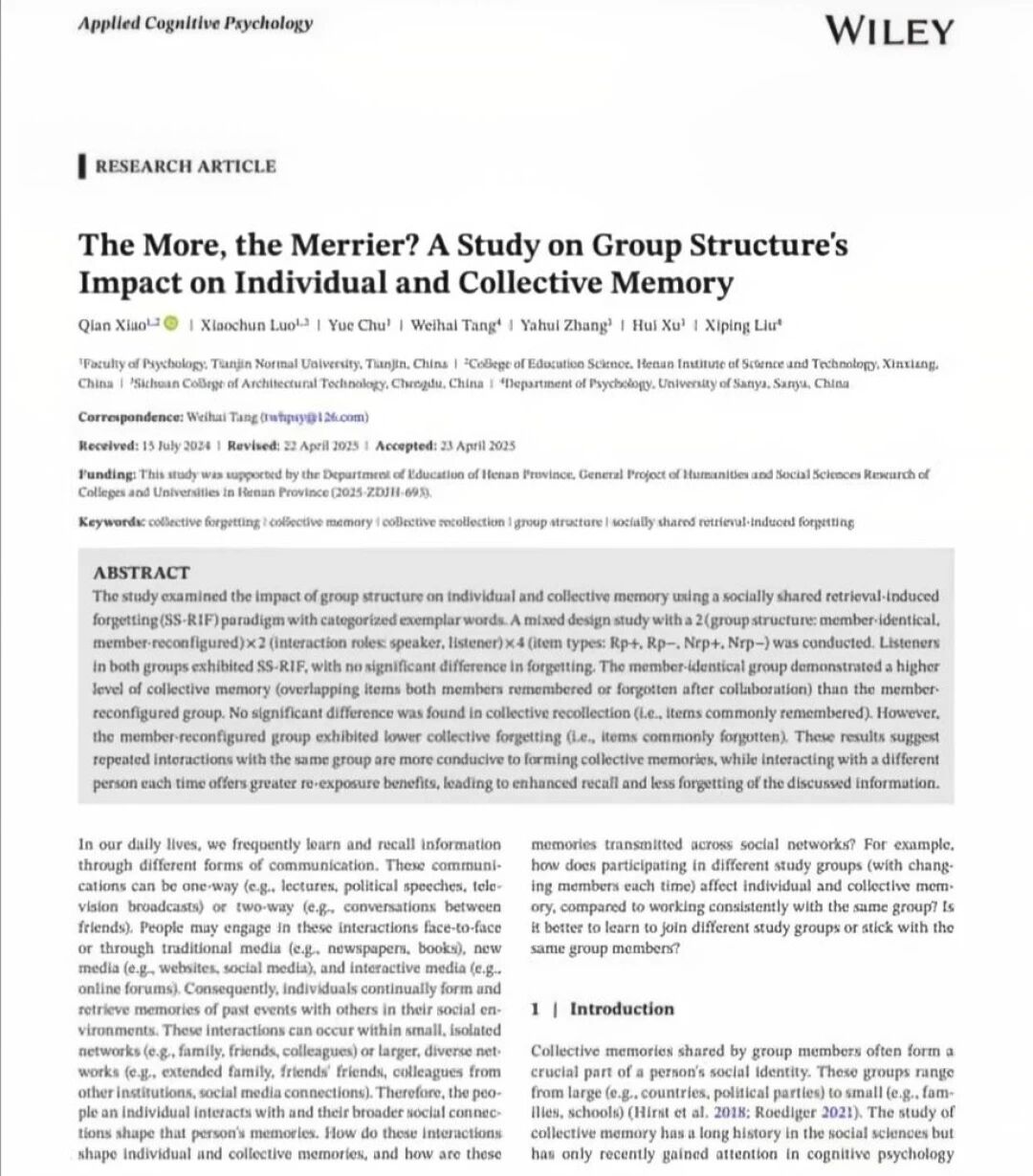 社会学院唐卫海教授及其团队在《Applied Cognitive Psychology 》39卷3期(2025年)发表 英文论文《The More, the Merrier? A Study on Group Structure's Impact on Individual and Collective Memory》。 《Applied Cognitive Psychology》是心理学类期刊,为SSCI检索期刊,其分区为JCR Q2。文章内容简介如下。