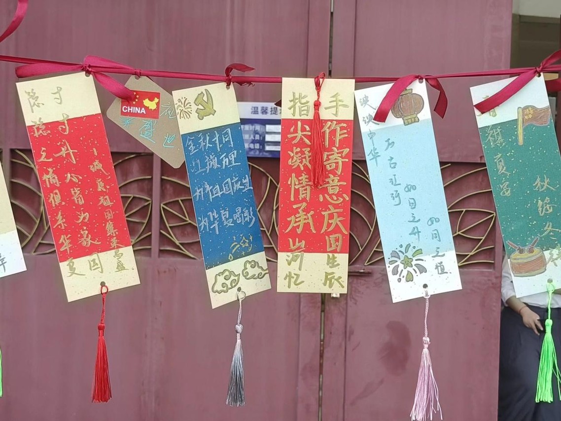 师生们时而轻声交流创作构思,时而协助固定贴纸,现场氛围专注而温馨。随着创作完成,一幅幅色彩斑斓的画作和一枚枚意蕴深长的书签逐渐呈现在大家眼前。这些作品将宏大的情感凝聚于方寸之间,每一笔描绘、每一次粘贴,都是师生们对祖国峥嵘岁月的追忆与对盛世华诞最真挚的祝福。