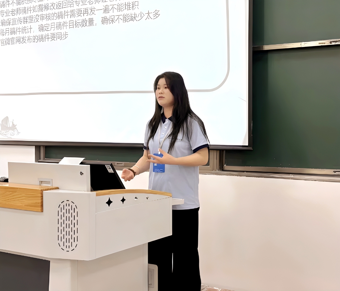 随后社长吴永豪开展了新闻采编专题培训,重点强调了新闻时效性、标题规范及稿件类型差异。她表示,新闻标题应采用“前缀+具体事件”的结构,正文首段需明确时间、地点、人物与活动目的,主体部分详述活动流程,结尾需体现活动反响与影响。稿件撰写需严格确保教师职称准确无误;使用人工智能辅助创作时,应提供详尽提示词,并通过人工校验确保语句通顺、逻辑严谨。发布前须完成审校流程,确保内容真实客观、语言流畅,图片与文本匹配且排版规范。