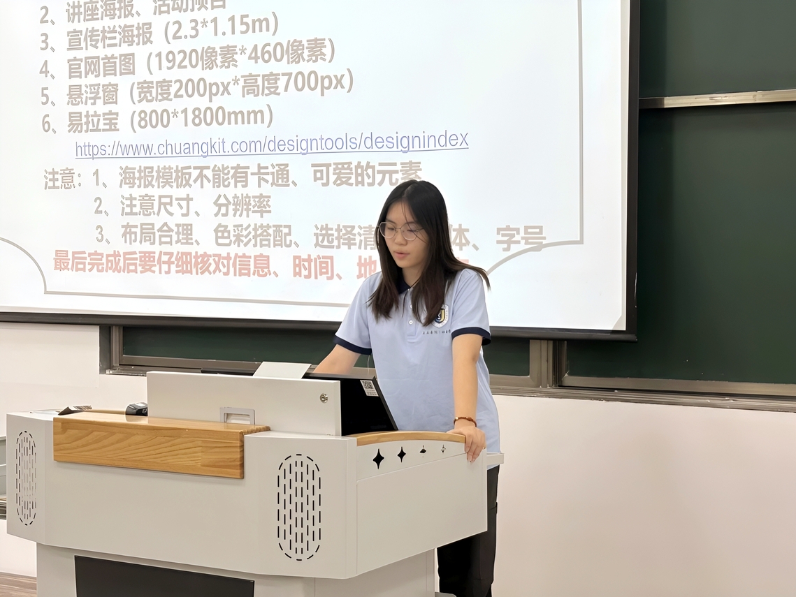 副社长刘丁宁深入阐释了海报设计要点,系统解析了如何通过视觉艺术吸引受众并有效传递核心信息。她介绍了节日节气类、讲座预告、宣传栏、官网首图等多种海报类型,并现场演示了借助专业设计平台完成设计的流程。她强调了海报设计应避免使用的元素,并着重指出需注重尺寸、分辨率、布局合理性、色彩搭配及字体清晰度等关键要素。