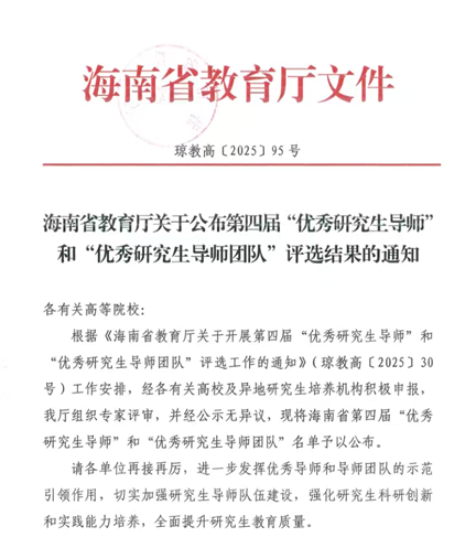 肖芒教授领衔的“农村社会工作研究生导师团队”(团队成员:陈强教授、涂爱仙教授、韩潇霏副教授)紧密对接国家乡村振兴战略和海南自贸港建设需求,聚焦农村社会发展关键问题,形成了鲜明的特色研究方向。团队成员精诚合作,在研究生培养、科学研究和社会服务方面取得了丰硕成果。获评“海南省优秀研究生导师团队”,是对该团队整体实力、协同育人模式及社会贡献的高度肯定。