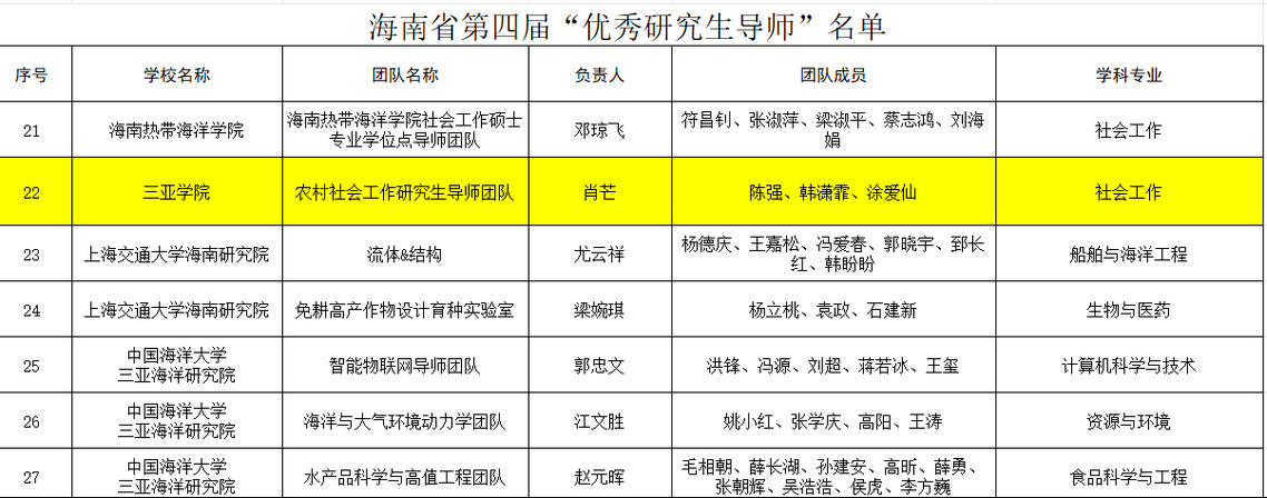 近日,海南省教育厅公布第四届“优秀研究生导师”及团队评选结果,三亚学院社会工作专业苏米雅教授获“海南省优秀研究生导师”称号,肖芒教授团队以“农村社会工作研究生导师团队”获评优秀团队。这是三亚学院首次在省级研究生教育最高荣誉评选中同时斩获个人与团队两项殊荣,实现历史性突破,彰显我校在研究生培养质量、导师队伍建设和学科专业发展上的显著成效,也标志着研究生教育水平迈上新台阶。
