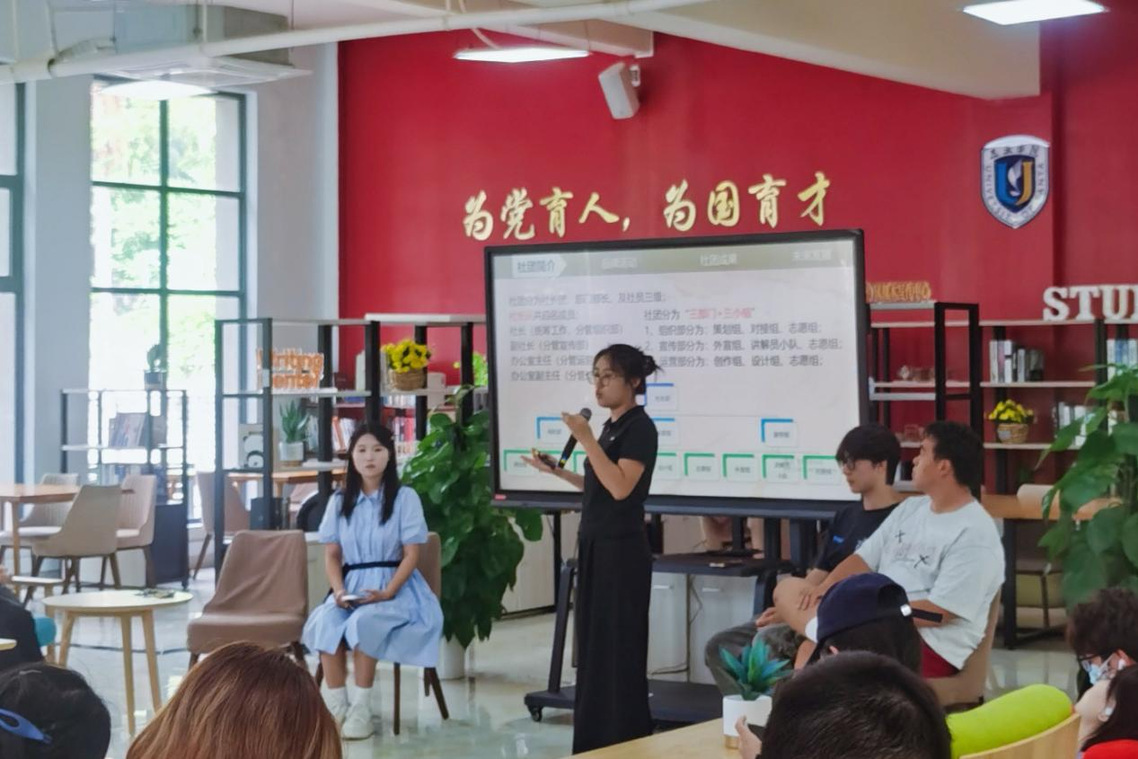 “以书会友,与友论书,在交流中读懂社会,在思考中实现成长。”悦读书社社长王悦涵率先分享。作为蝉联校五星级社团、斩获六次“社团月之星”的学术型社团,悦读书社以“认识社会,理解社会”为宗旨,打破传统读书会的枯燥模式,打造了电影沙龙、主题漫谈、校际联动读书会等多元化活动。
