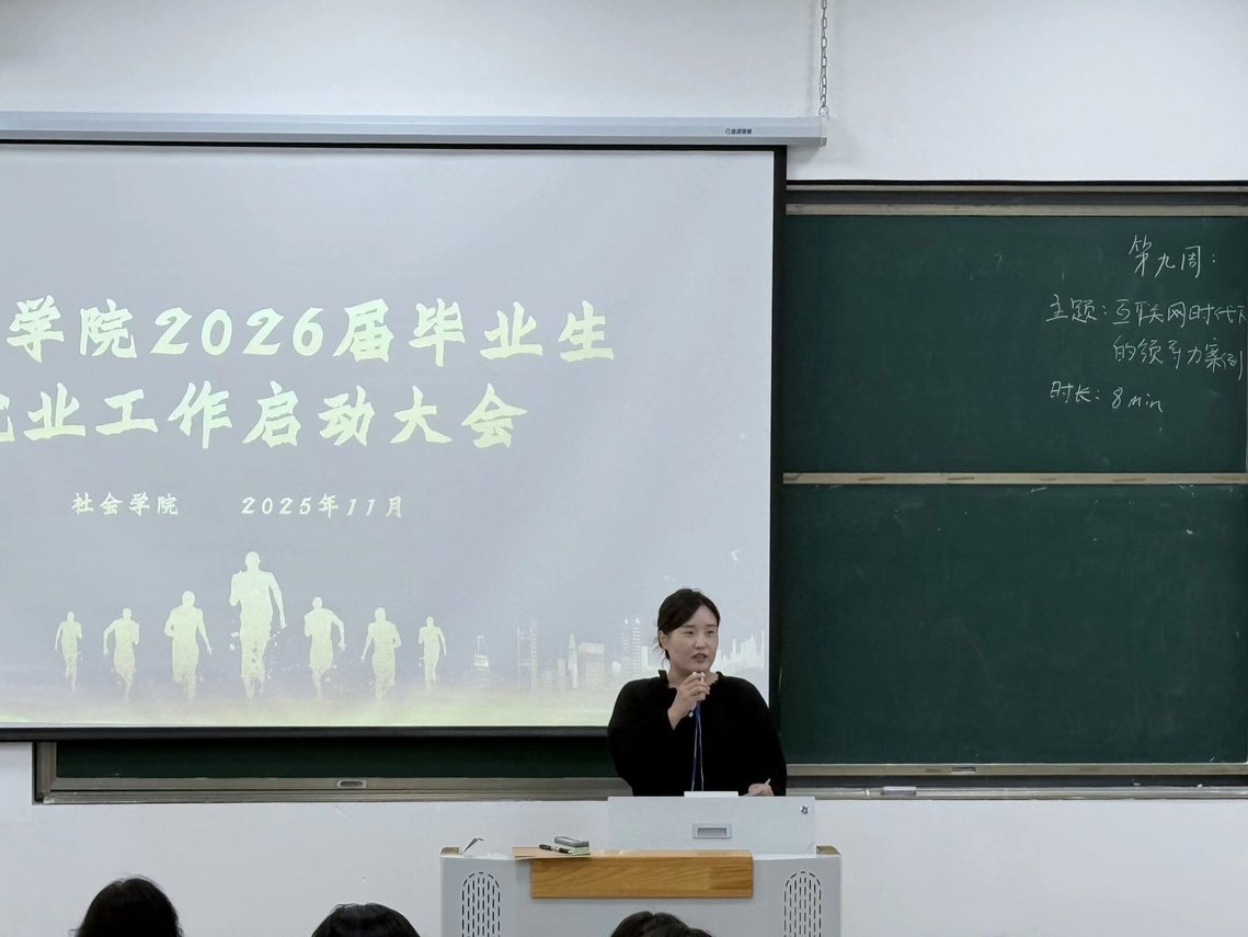 为积极应对高校毕业生就业新形势,助力2026届毕业生准确把握就业方向,2025年11月12日,社会学院举行了社会学系2026届毕业生就业启动大会。社会学院学术委员会副主任肖芒教授,社会学系副主任杨扬出席会议,白晓梦老师主持活动,2026届社会学专业全体毕业生参加大会。