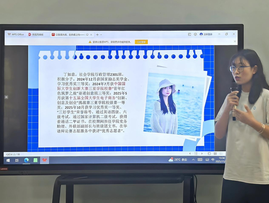 为充分发挥优秀学生的榜样示范作用,营造浓厚学习氛围,社会学院学业导师李曼副教授11月11日在学生中心主持举办了主题为“追光者说:从平凡到卓越的破茧之路——奖学金获得者分享成长经验”的朋辈分享会活动。本次分享会特邀社会学院国家奖学金获得者行政2301班丁如意、心理230班黄培嘉、行政(专升本)2402班陶雨菲,以及学业一等奖学金获得者行政2401班游嘉盈四位同学,与在场同学面对面交流,分享她们从平凡走向卓越的成长心得与奖学金获取经验。