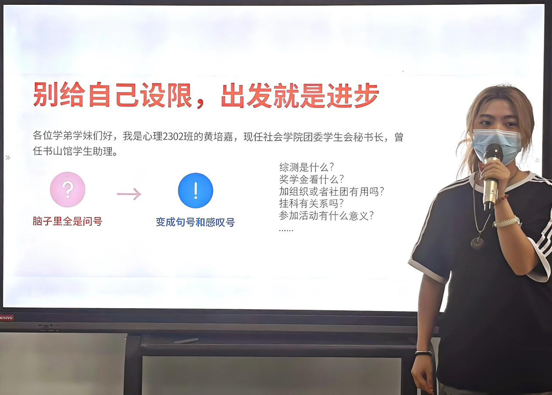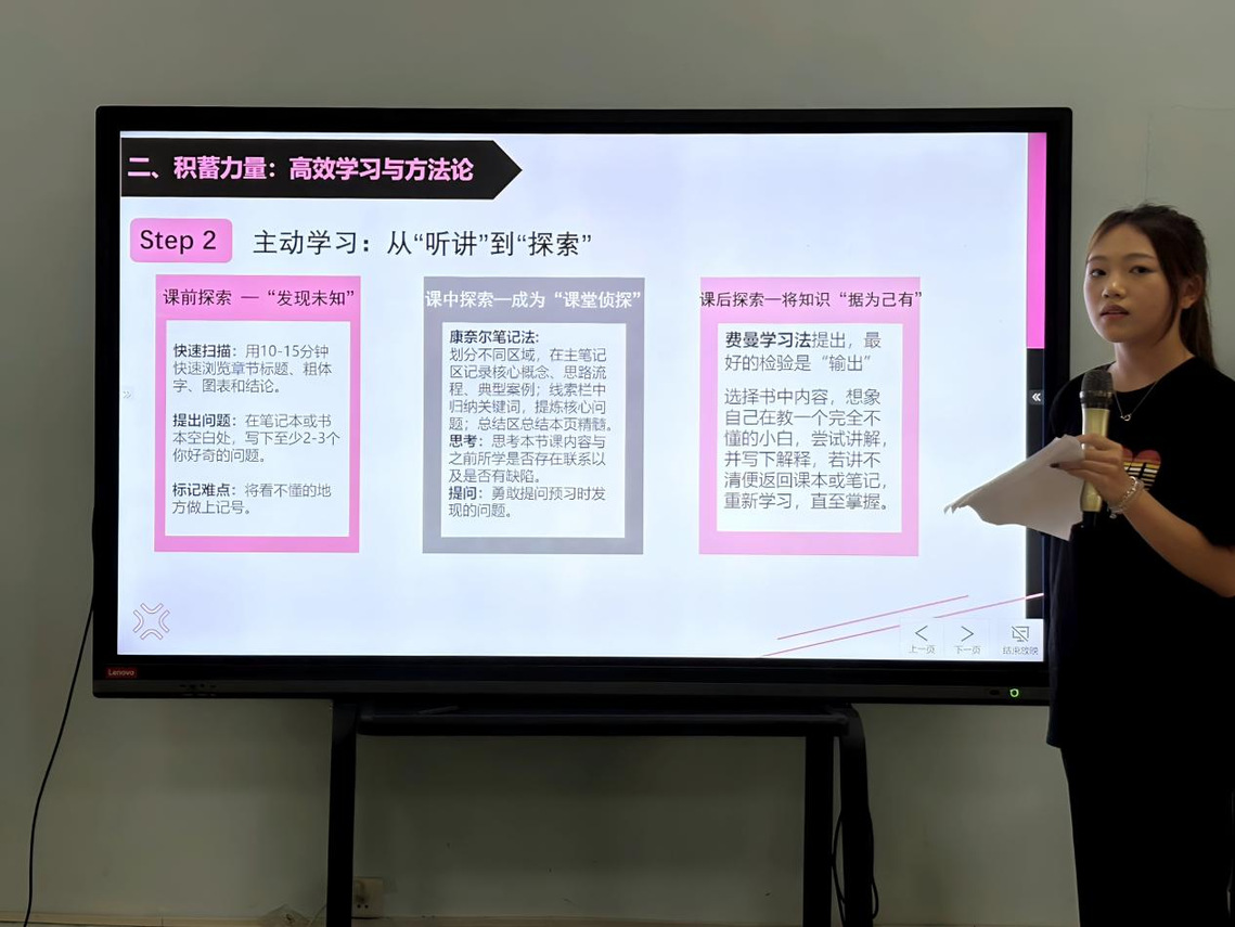 “不要自我设限,积极尝试,当下的行动就是最好的开始。”心理2302班的黄培嘉同学用充满激情的分享鼓励在场同学。她认为,大学里竞赛、活动等机会成本低,是试错成长的绝佳平台。她提出“哄着自己学习”的趣味方法,通过设定小目标让自己逐步进入学习状态。在学业上,她坚持课堂认真听讲、考前认真复习的基本原则,并积极参与创新实践和志愿服务,将老师的教学案例化为己用,做到学以致用。