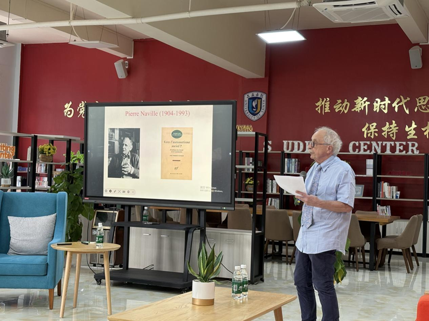 随后,社会学院周强教授对主讲人进行了详细介绍。他提到,米歇尔·普鲁姆教授是法国学术界的资深领袖,曾任巴黎第七大学跨文化研究与应用语言学院院长等多项要职,学术造诣深厚,领导经验丰富。周强教授特别强调了普鲁姆教授在思想史经典翻译与研究方面的卓越成就,包括合作编辑亚当·斯密的《国富论》与大卫·李嘉图的金融著作,以及主编达尔文12卷全集——《人类的起源》与《物种起源》等。他总结道,本次讲座将引领大家探索一位先驱思想家对当今技术时代的惊人预见,并提醒大家讲座将以全英文进行,鼓励大家积极参与互动。