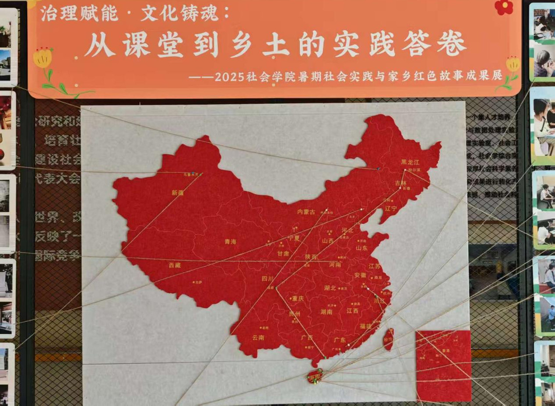 12月2日,社会学院文化节系列活动之2025暑期社会实践与家乡红色故事成果展正式亮相,一面绘有红色中国地图、缀满实践轨迹的展墙,成为校园里最鲜活的“乡土课堂”。
