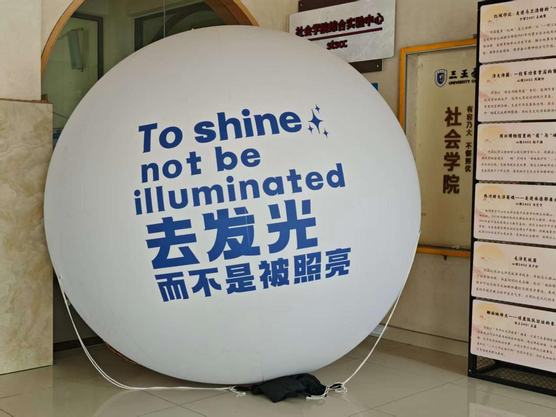 展厅一隅,“去发光,而不是被照亮”的巨型标语格外醒目,这既是对学子投身实践的精神寄语,也是学院实践育人理念的生动表达。展墙上,“椰风拂乡野,支教暖童心”“探海古村落,守护渔家文化”“青少年法治‘治’行调研记”等数十个实践项目展板依次排开,每一块展板都用图文、影像记录着师生深入乡村、社区、海岛的实践足迹:从为乡村儿童开展支教服务,到走访渔村挖掘海洋文化遗产;从参与未成年人犯罪预防调研,到为军属提供暖心守护,社会学院的学子们将课堂上的理论知识,转化为服务乡土的实际行动。