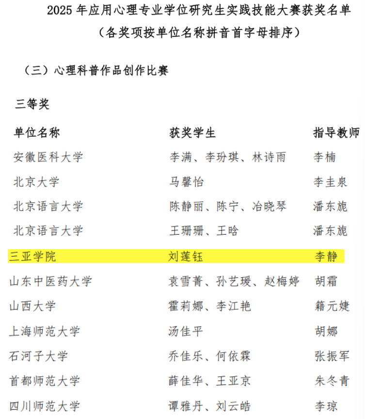 此次获奖不仅是对学生专业能力和创新精神的认可,也是我院持续推进应用心理专业实践教学改革、注重实践能力培养的成果体现。今后,学院将继续以各类专业竞赛为平台,进一步优化实践育人机制,鼓励学生扎根专业、回应社会需求,促进心理学理论与实践的深度融合,着力培养更多具有扎实专业素养和良好服务意识的应用心理人才。