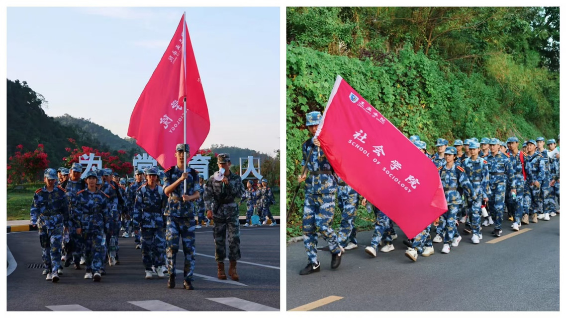 拉练过程中,社会学院的学子们迈着整齐的步伐,一路并肩前行。途中有人脚步渐沉,身边的同学便主动搀扶;有人面露疲惫,同伴的呐喊便随即响起。即便汗水浸透衣衫,他们也始终昂首向前,无人轻言放弃。