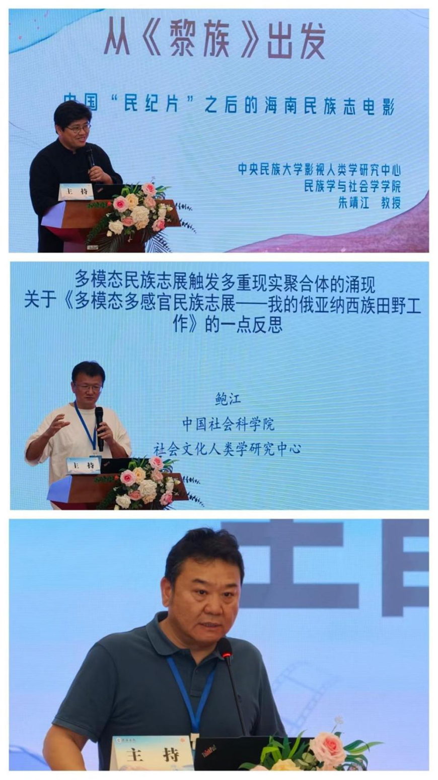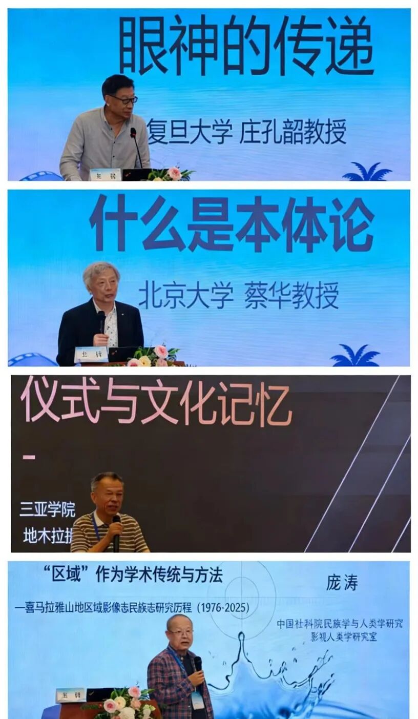 主旨报告环节,复旦大学的庄孔韶教授作了《眼神的传递》、北京大学的蔡华教授作了《什么是本体论》、三亚学院的迪木拉提教授作了《仪式与文化记忆》、中国民族学学会影视人类学分会常务副会长庞涛研究员作了《“区域”作为学术传统与方法——喜马拉雅山地区域影像民族志研究历程(1976-2025)》、中国社会科学院社会学所鲍江研究员作了《多模态田野研究触发多重现实聚合体的涌现》、国家图书馆田苗研究馆员(韩尉副研究馆员、戴晓晔副研究馆员代)作了《人口较少民族口头传承典藏计划简报》、中央民族大学朱靖江教授作了《从<黎族>出发:中国“民纪片”之后的海南民族志电影》的精彩演讲。主旨发言由中国民族学学会影视人类学分会副会长、兰州大学教授王海飞主持。