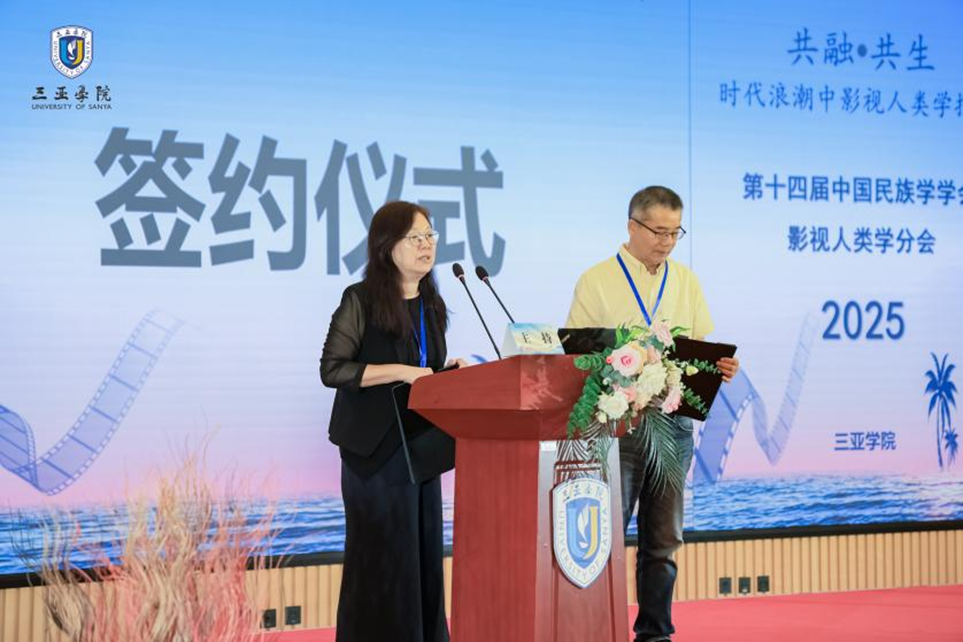 年会开幕式由三亚学院社会学院院长刘夏蓓教授主持。首先,中国社会科学院民族学与人类学研究所党委书记兼中国民族学学会影视人类学分会会长赵天晓致辞。他代表影视人类学分会向各位同仁的到来表示热烈欢迎,向三亚学院的鼎力支持致以诚挚谢意!他提到我们正站在一个新的历史交汇点上:一方面,全球化与数字化浪潮以前所未有的力量重塑着人类生活的时空逻辑;另一方面,中华优秀传统文化持续焕发新生,为我们理解人、社会与自然的关系提供着深邃智慧。在此背景下,“共融·共生”不再只是一种理念,更成为学科发展的必然路径与实践伦理。他指出影视人类学正经历从纪录之眼到互动共生的范式的深刻转变。接着,三亚学院朱沁夫副校长对到来的嘉宾朋友表示了热烈欢迎,向长期关心支持三亚学院的同仁致以诚挚谢意。三亚学院自建校以来,一直坚持党的领导,贯彻党的教育方针,注重学科建设与人才培养。近年来,学校不断完善科研平台和教学设施,社会学、人类学等相关学科取得稳步发展。北京爱奇艺科技有限公司执行总编辑王亮先生在致辞中热烈祝贺年会的召开。他表示,在过去15年的发展历程中,爱奇艺为纪录片与非虚构作品提供了坚定的平台支持。今后,爱奇艺愿意持续加强与高校、研究机构和学术团体的合作,让影视创作在学术理念的指导下,探索兼具传播价值与社会意义的表达路径。北京大学社会学院李建新教授与三亚学院社会学院院长刘夏蓓教授还在开幕式上交换了双方关于创立“一带一路与海疆发展论坛”合作意向书。