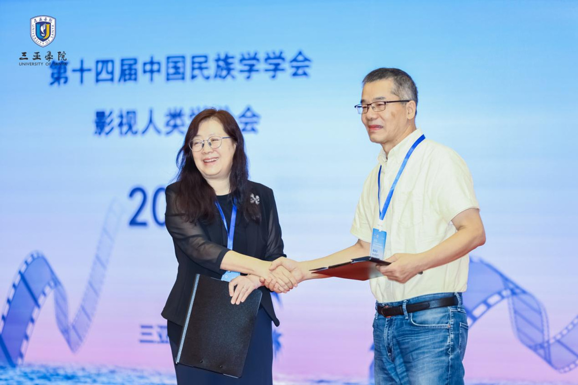 年会开幕式由三亚学院社会学院院长刘夏蓓教授主持。年会伊始,中国社会科学院民族学与人类学研究所党委书记、副所长兼中国民族学学会影视人类学分会赵天晓会长致辞。他提到我们正站在一个新的历史交汇点上:一方面,全球化与数字化浪潮以前所未有的力量重塑着人类生活的时空逻辑;另一方面,中华优秀传统文化持续焕发新生,为我们理解人、社会与自然的关系提供着深邃智慧。在此背景下,“共融·共生”不再只是一种理念,更成为学科发展的必然路径与实践伦理。他指出影视人类学正经历从纪录之眼到互动共生的范式的深刻转变。随后,三亚学院朱沁夫副校长对到来的嘉宾朋友表示了热烈欢迎,向长期关心支持三亚学院的同仁致以诚挚谢意。三亚学院自建校以来,一直坚持党的领导,贯彻党的教育方针,注重学科建设与人才培养。近年来,学校不断完善科研平台和教学设施,社会学、人类学等相关学科取得稳步发展。北京爱奇艺科技有限公司执行总编辑王亮先生在致辞中热烈祝贺年会的召开。他表示,在过去15年的发展历程中,爱奇艺为纪录片与非虚构作品提供了坚定的平台支持。今后,爱奇艺愿意持续加强与高校、研究机构和学术团体的合作,让影视创作在学术理念的指导下,探索兼具传播价值与社会意义的表达路径。北京大学社会学院李建新教授与三亚学院社会学院院长刘夏蓓教授还在开幕式上交换了双方关于创立“‘一带一路’与海疆发展论坛”合作意向书。作为此次会议承办方的三亚学院社会学院与北京大学社会学有着深厚的渊源。社会学院的创始人沈关宝先生是中国人类学家费孝通先生的弟子,多年来,三亚学院社会学科发展得到北京大学多位社会学教授的大力指导与帮助。